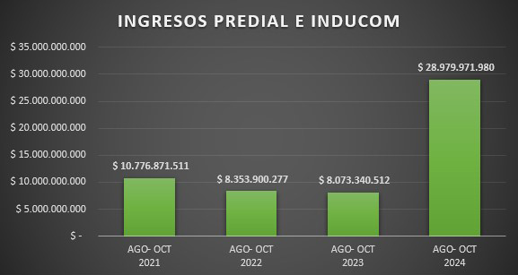 La gestión de Microshif se ve reflejada en los resultados, pues desde agosto hasta octubre de 2024, el municipio ha recaudado un total de $28.979.971.980 en impuesto predial e industrial y comercio (Inducom), una cifra muy destacada si se compara con los ingresos en el mismo periodo de tiempo en vigencias anteriores como se expone a continuación: